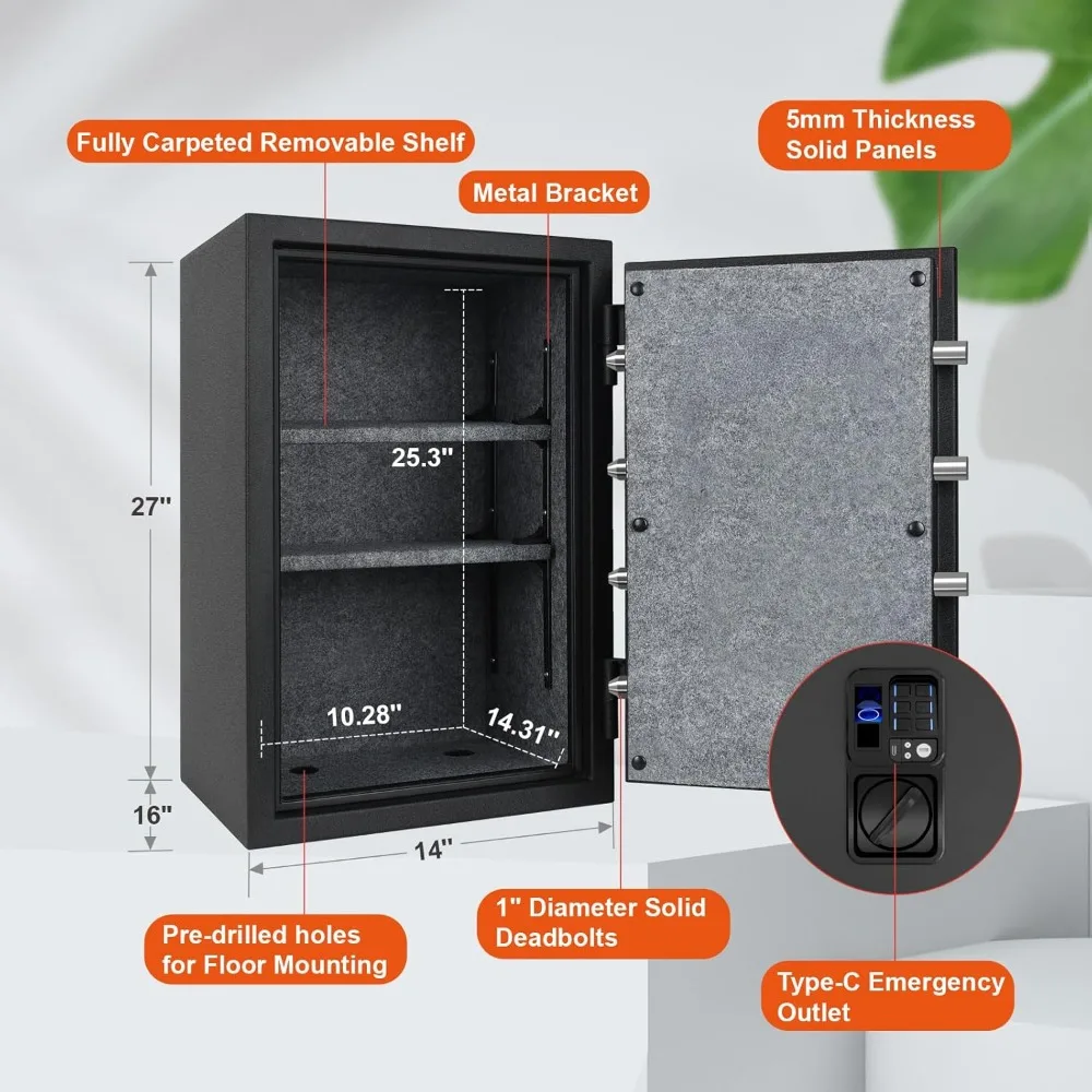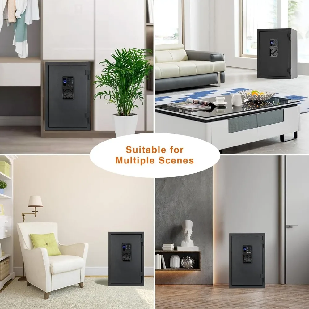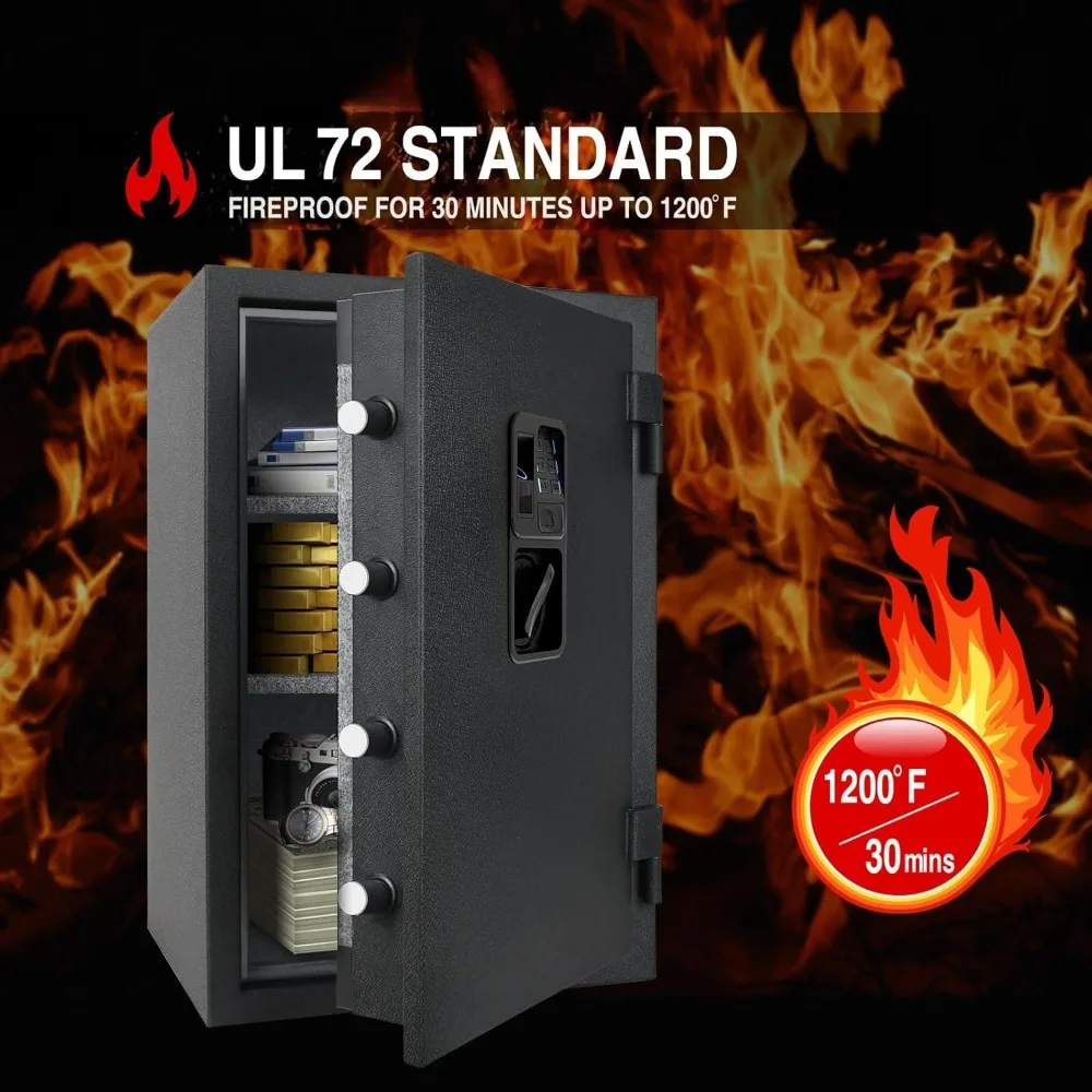 Heavy Duty Fire Safe: Finger vein fireproof safe is made of anti-theft solid steel and provides 30 minutes of fire protection equipment at 1200°F. 5mm heat-resistant solid fireproof board and 1-inch diameter solid steel bolts provide reliable protection. Comply with UL 72 standard. This safe box is perfect for protecting cash, jewelry, cameras, guns, ammunition, important documents and more valuables.