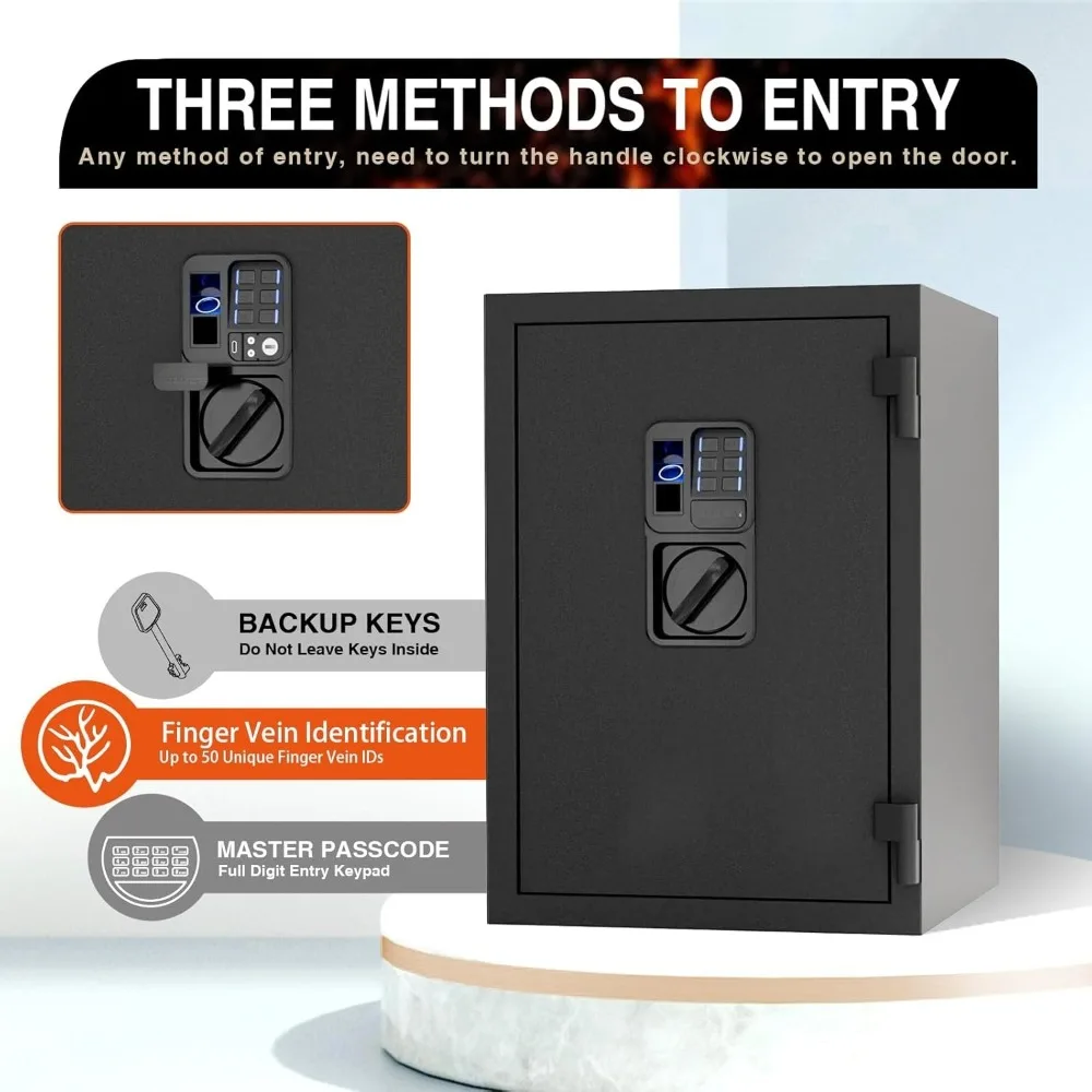 SUPER BIOMETRIC FINGER VEIN RECOGNITION LOCK:This biometric safe comes with an advanced finger vein recognition sensor, full digit backlight keypad and two backup keys. Finger vein recognition technology reads images of your blood vessel texture distribution within 3 mm under the skin through near-infrared imaging. It won't be affected by or interfered with water, dirt, sweaty fingers, skin damage, or any other skin conditions.