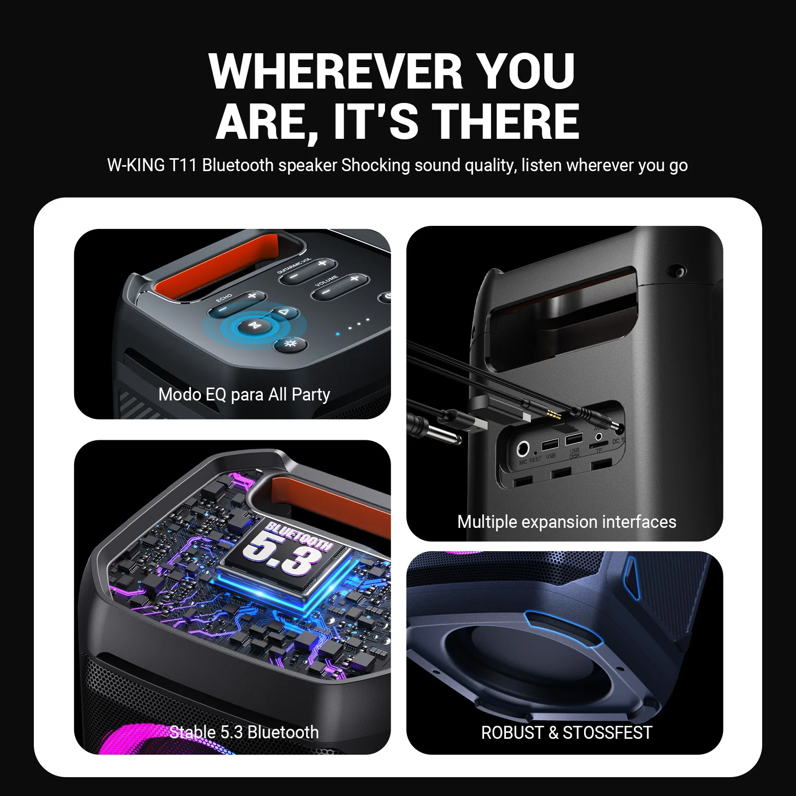 【EQ Mode & Multiple Playback Modes】T11 large partybox has bass and treble modes (indoor/outdoor), just long-press the 'Triangular Tandem' button for 2 seconds to tailor your favorite sound. Enjoy deep bass, clear mids, and crisp treble. T11 portale bluetooth speaker supports Bluetooth 5.3, TF card, 3.5mm AUX audio cable and USB flash drive to transfer your favorite music. Turn on your W-KING T11, rock all day, and let the music last until dawn. The bluetooth speaker is best choice for gifts, birthdays, holiday!