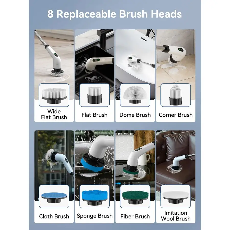 8 Replaceable MultiPurpose Brush Heads The electric cleaning brush comes with 8 replaceable brush heads for tiles, grout, glass, and more. Easily tackle tough stains in kitchens, bathrooms, and beyond. With this versatile electric scrubber, any surface will be as clean as new.